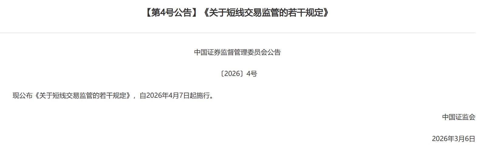 3月6日晚间,证监会在官网发布《关于短线交易监管的若干规定》(以下简称《若干规定》),自2026年4月7日起施行。