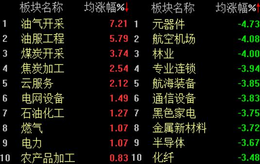 板块方面,油服工程、煤炭开采、油气设服、煤化工概念、电网设备等涨幅居前,CPO概念、MLCC、铜缆高速连接等板块表现不佳,跌幅居前。