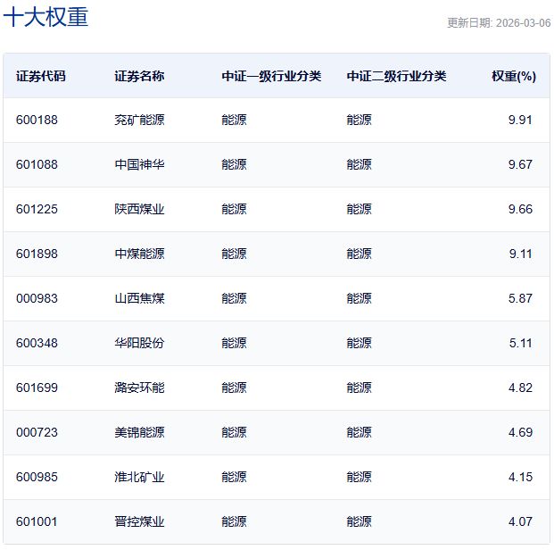 中证煤炭指数主要权重股