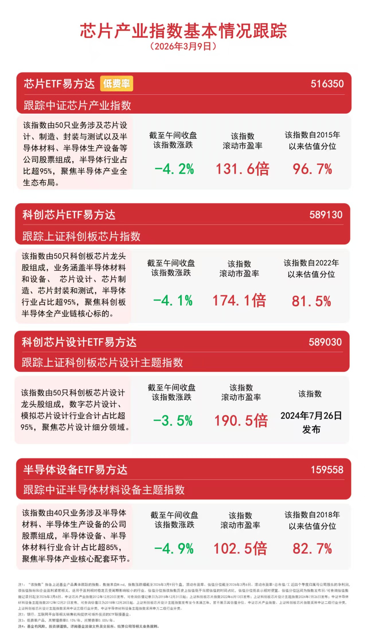 3月9日早盘,芯片产业链集体下挫。截至午间收盘,上证科创板芯片设计主题指数下跌3.5%,上证科创板芯片指数下跌4.1%,中证芯片产业指数下跌4.2%,中证半导体材料设备主题指数下跌4.9%,资金逆势布局,半导体设备ETF易方达(159558)半日净申购达3200万份。