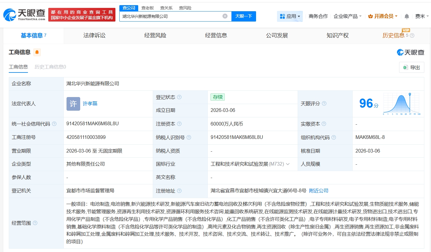 每经AI快讯,天眼查App显示,近日,湖北华兴新能源有限公司成立,法定代表人为许孝磊,注册资本6亿元人民币,经营范围包括电池制造、电池销售、新兴能源技术研发等。股东信息显示,该公司由万华化学(600309)旗下万华化学(烟台)电池产业有限公司、兴发集团(600141)共同持股。