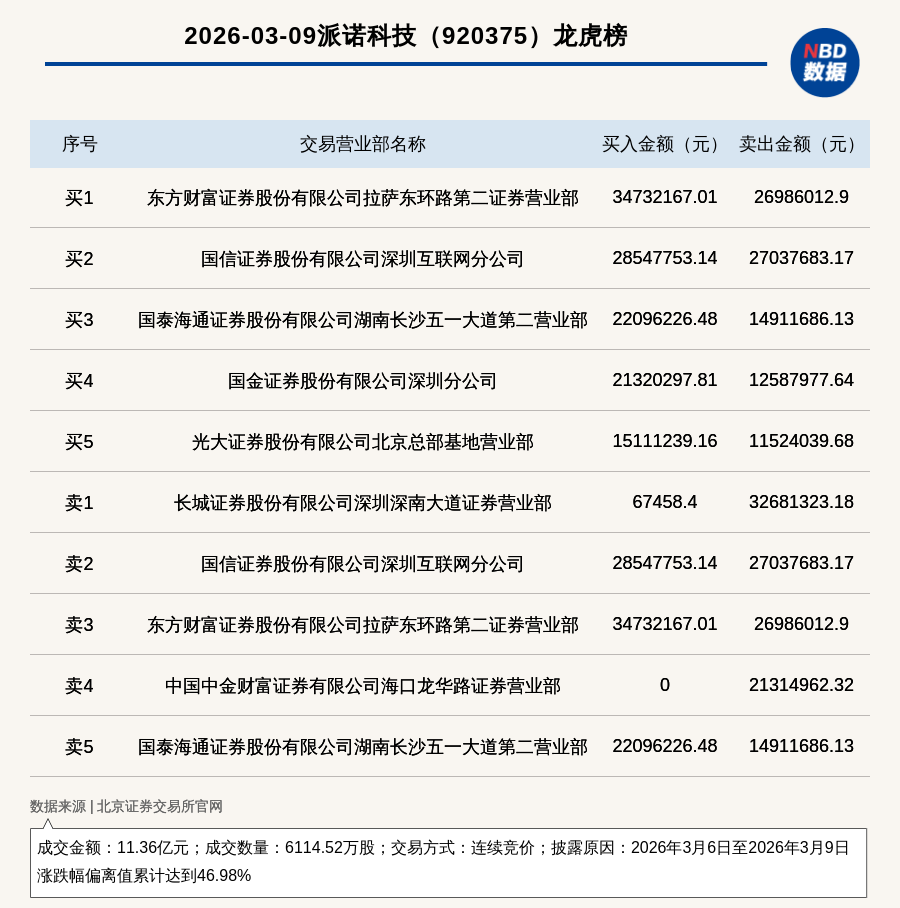 每经讯,2026年3月9日,北交所上市公司派诺科技(920375,收盘价:20.6元)登上龙虎榜,交易方式是连续竞价,披露原因是2026年3月6日至2026年3月9日涨跌幅偏离值累计达到46.98%,成交数量6114.52万股,成交金额11.36亿元。买一席位为东方财富证券股份有限公司拉萨东环路第二证券营业部,买入3473.22万元;卖一席位为长城证券股份有限公司深圳深南大道证券营业部,卖出3268.13万元。