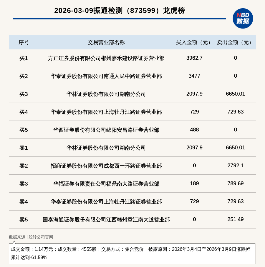 每经讯,2026年3月9日,新三板创新层公司振通检测(873599,收盘价:1.89元)登上龙虎榜,交易方式是集合竞价,披露原因是2026年3月4日至2026年3月9日涨跌幅累计达到-61.59%,成交数量4555股,成交金额1.14万元。买一席位为方正证券股份有限公司郴州嘉禾建设路证券营业部,买入3962.7元;卖一席位为华林证券股份有限公司湖南分公司,卖出6650.01元。