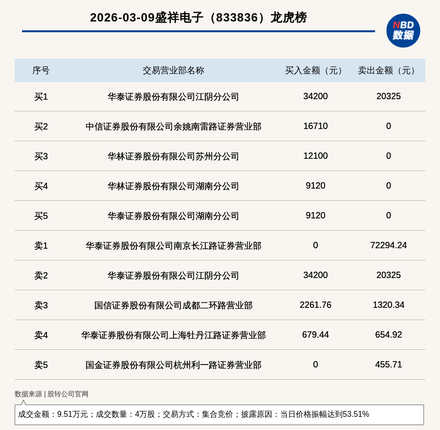 每经讯,2026年3月9日,新三板创新层公司盛祥电子(833836,收盘价:2.29元)登上龙虎榜,交易方式是集合竞价,披露原因是当日价格振幅达到53.51%,成交数量4万股,成交金额9.51万元。买一席位为华泰证券股份有限公司江阴分公司,买入3.42万元;卖一席位为华泰证券股份有限公司南京长江路证券营业部,卖出7.23万元。