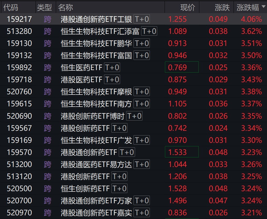 受盘面影响,港股创新药、恒生生物科技等相关ETF涨超3%。