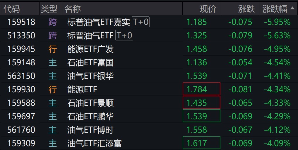 受盘面影响,多只油气、能源相关ETF跌超4%。