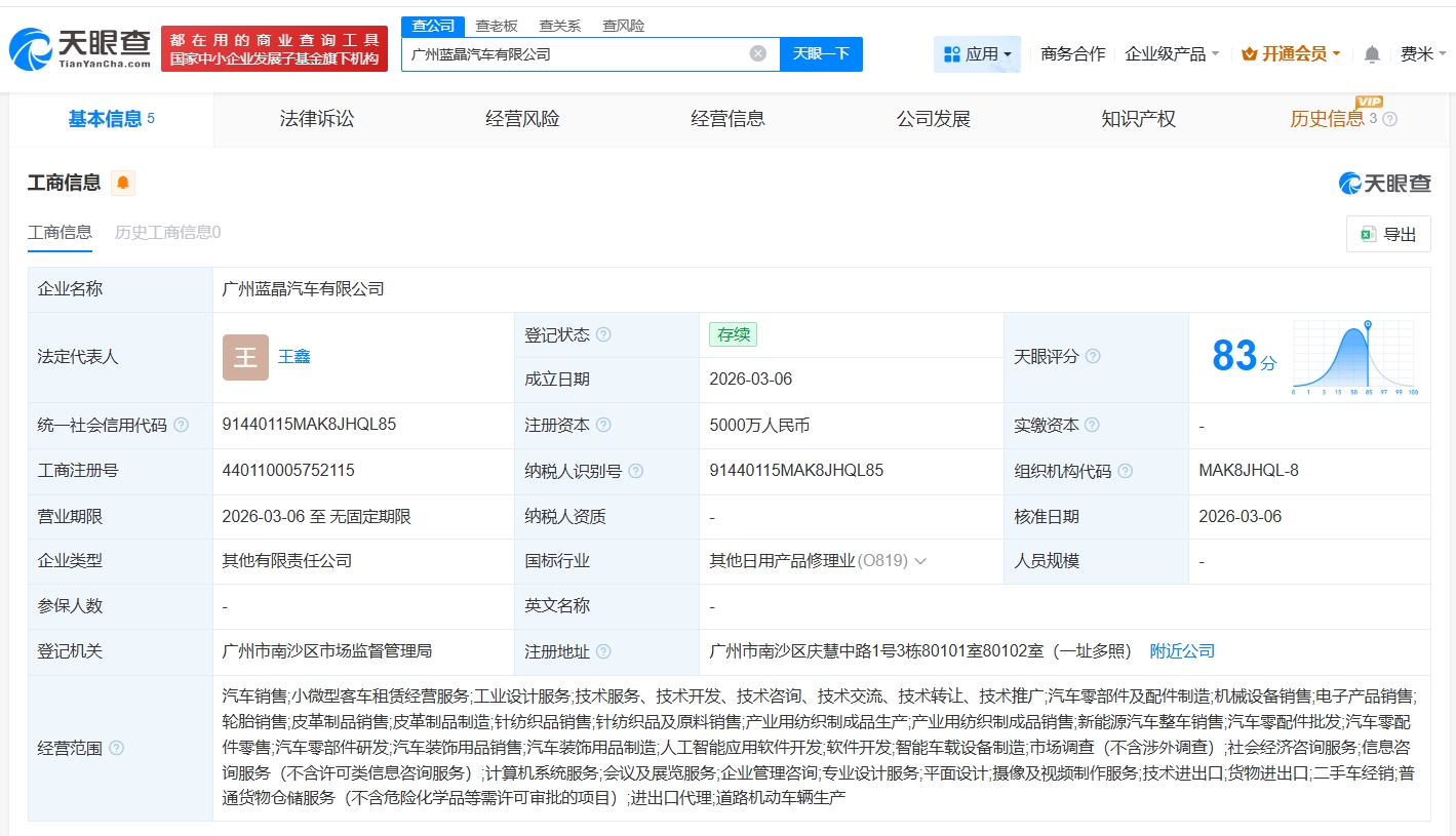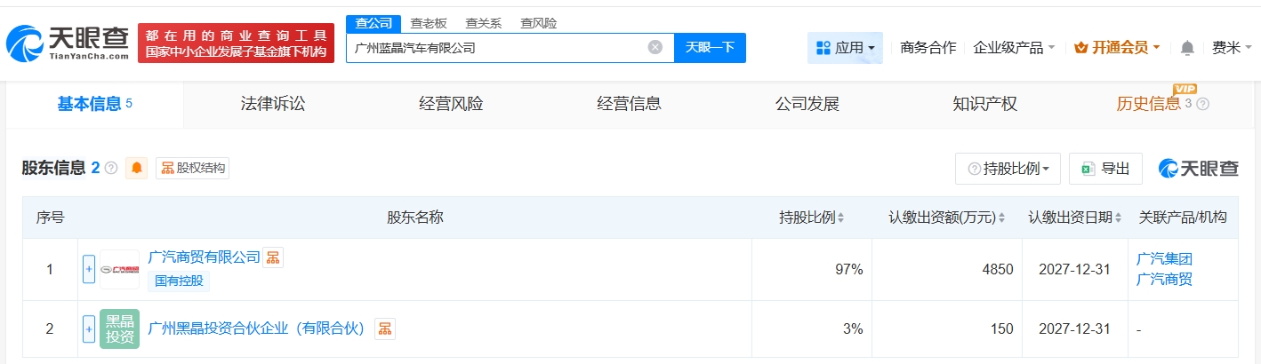 每经AI快讯,天眼查App显示,近日,广州蓝晶汽车有限公司成立,法定代表人为王鑫,注册资本5000万元人民币,经营范围包括新能源汽车整车销售、道路机动车辆生产、人工智能应用软件开发等。股东信息显示,该公司由广汽集团(601238)旗下广汽商贸有限公司、广州黑晶投资合伙企业(有限合伙)共同持股。