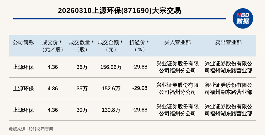 每经讯,2026年3月10日,新三板创新层公司上源环保(871690,收盘价:6.2元)发生3笔大宗交易,总成交金额为440.36万元,成交金额最高的一笔成交价4.36元/股,成交数量36万股,成交金额156.96万元,折价29.68%。买入营业部是兴业证券股份有限公司福州分公司,卖出营业部是兴业证券股份有限公司福州湖东路营业部。