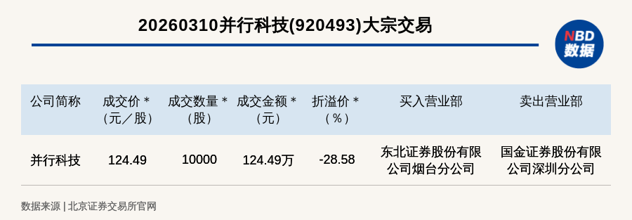 每经讯,2026年3月10日,北交所上市公司并行科技(920493,收盘价:174.3元)发生一笔大宗交易,成交价124.49元/股,成交数量10000股,成交金额124.49万元,折价28.58%。买入营业部是东北证券股份有限公司烟台分公司,卖出营业部是国金证券股份有限公司深圳分公司。