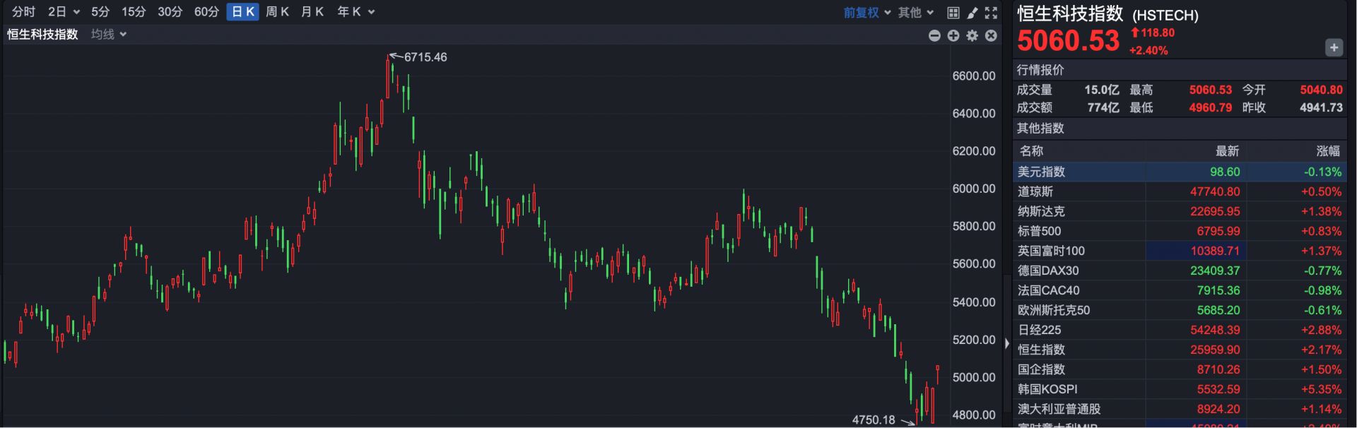 恒生科技指数收盘报5060.53点,上涨118.80点,涨幅2.40%。