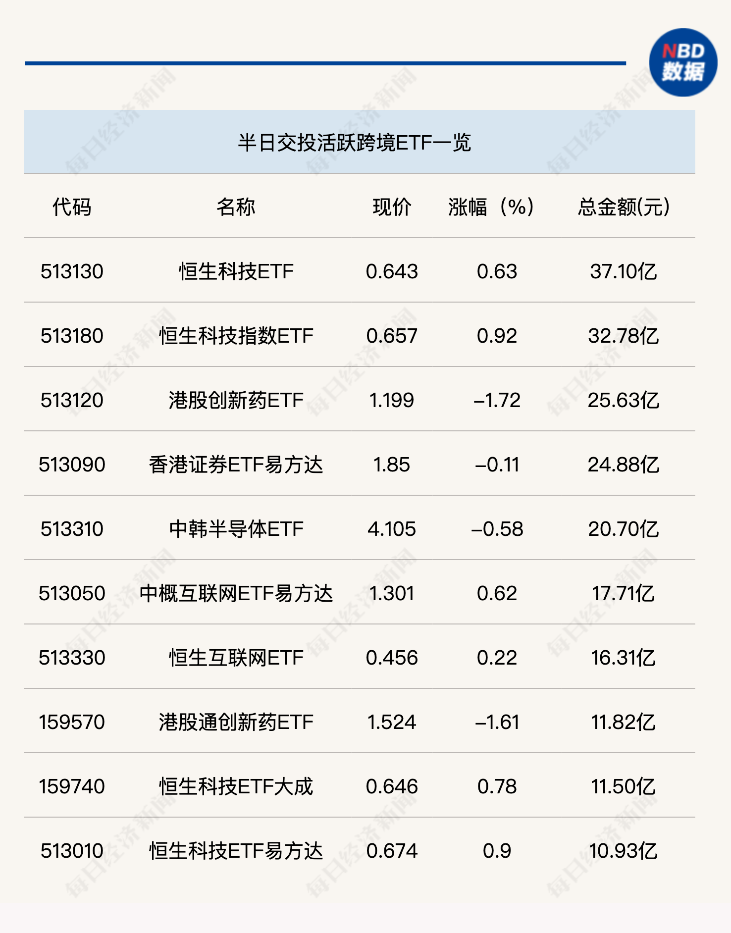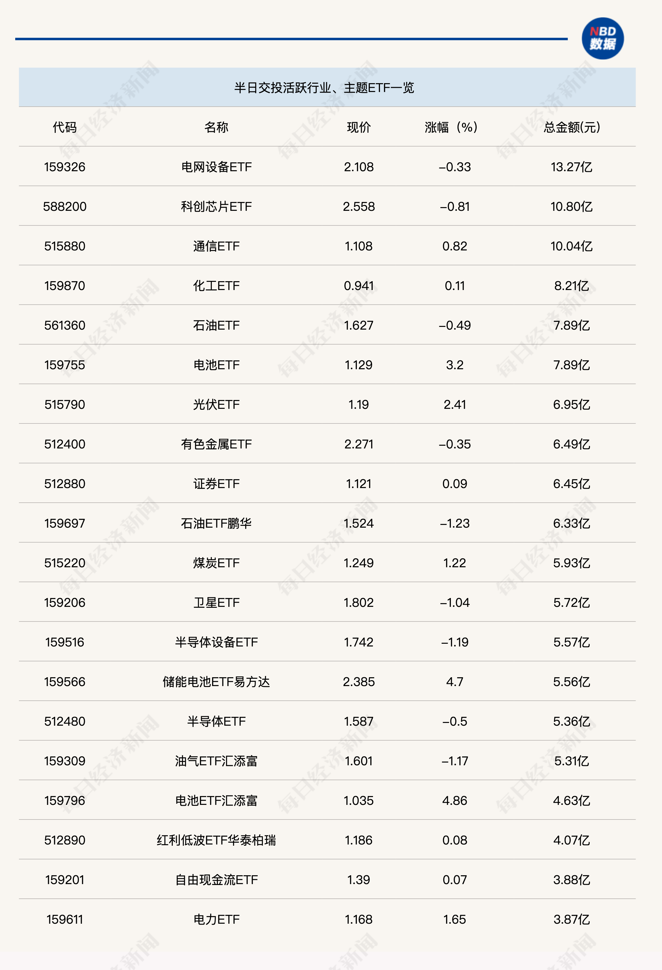 今日上午,行业、主题类ETF交投再度萎缩,电网设备ETF(159326)半日成交金额为13.27亿元,科创芯片ETF(588200)和通信ETF(515880)半日成交额均刚过10亿元。跨境ETF方面,今日暂无一只ETF成交超过40亿元。