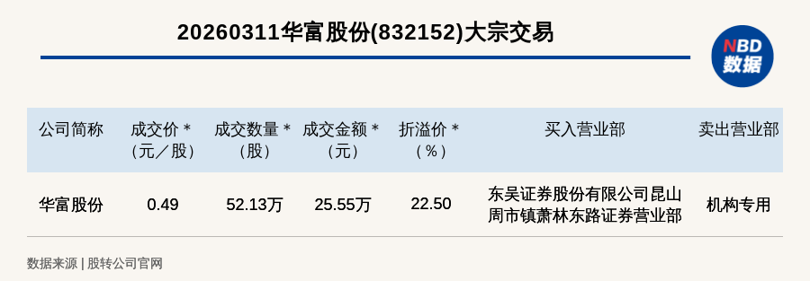 每经讯,2026年3月11日,新三板基础层公司华富股份(832152,收盘价:0.4元)发生一笔大宗交易,成交价0.49元/股,成交数量52.13万股,成交金额25.55万元,溢价22.5%。买入营业部是东吴证券股份有限公司昆山周市镇萧林东路证券营业部,卖出营业部是机构专用。