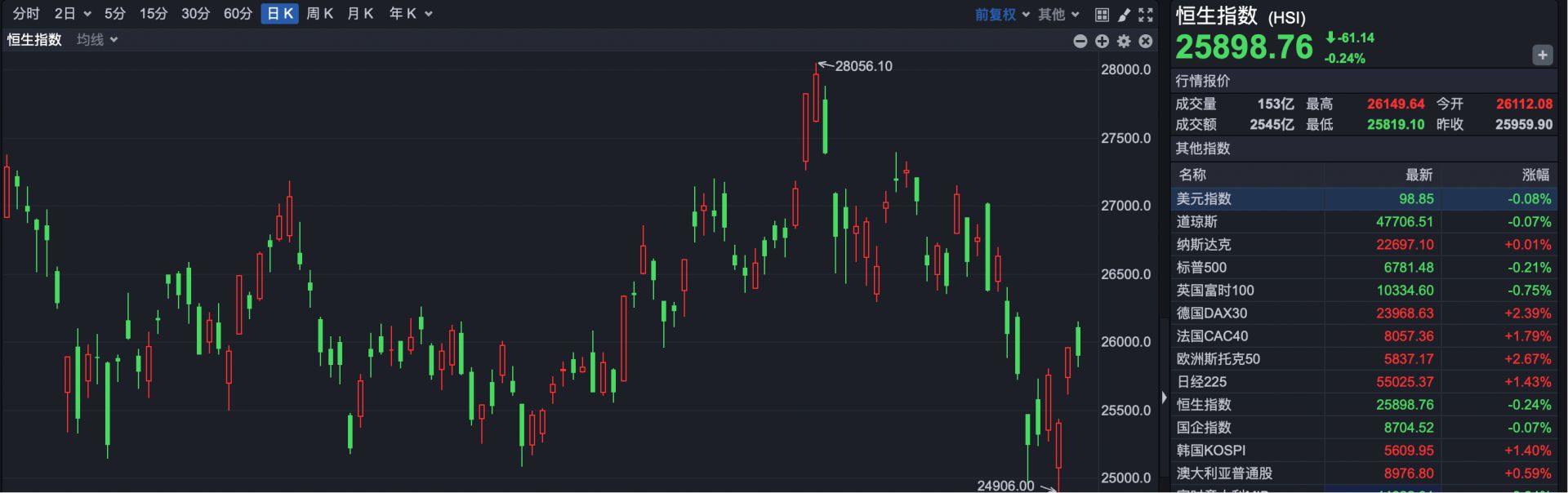 截至收盘,恒生指数报25898.76点,下跌61.14点,跌幅0.24%。