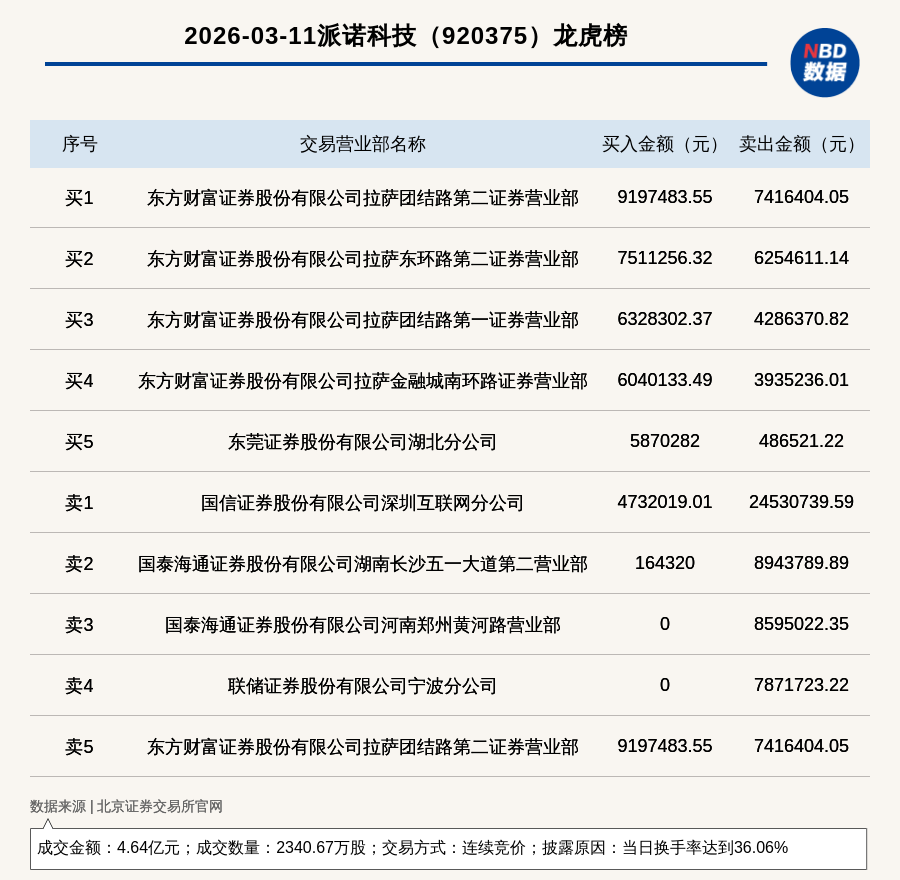 每经讯,2026年3月11日,北交所上市公司派诺科技(920375,收盘价:19.63元)登上龙虎榜,交易方式是连续竞价,披露原因是当日换手率达到36.06%,成交数量2340.67万股,成交金额4.64亿元。买一席位为东方财富证券股份有限公司拉萨团结路第二证券营业部,买入919.75万元;卖一席位为国信证券股份有限公司深圳互联网分公司,卖出2453.07万元。