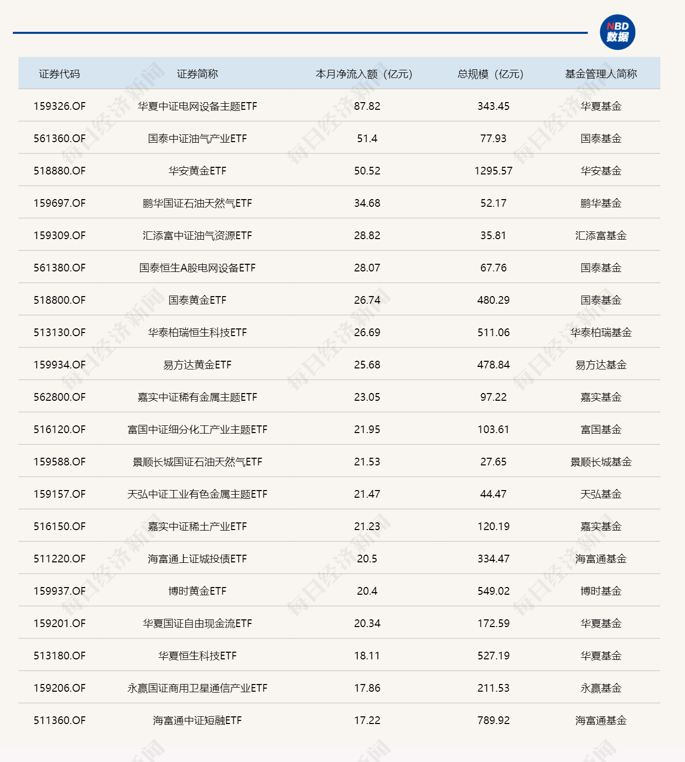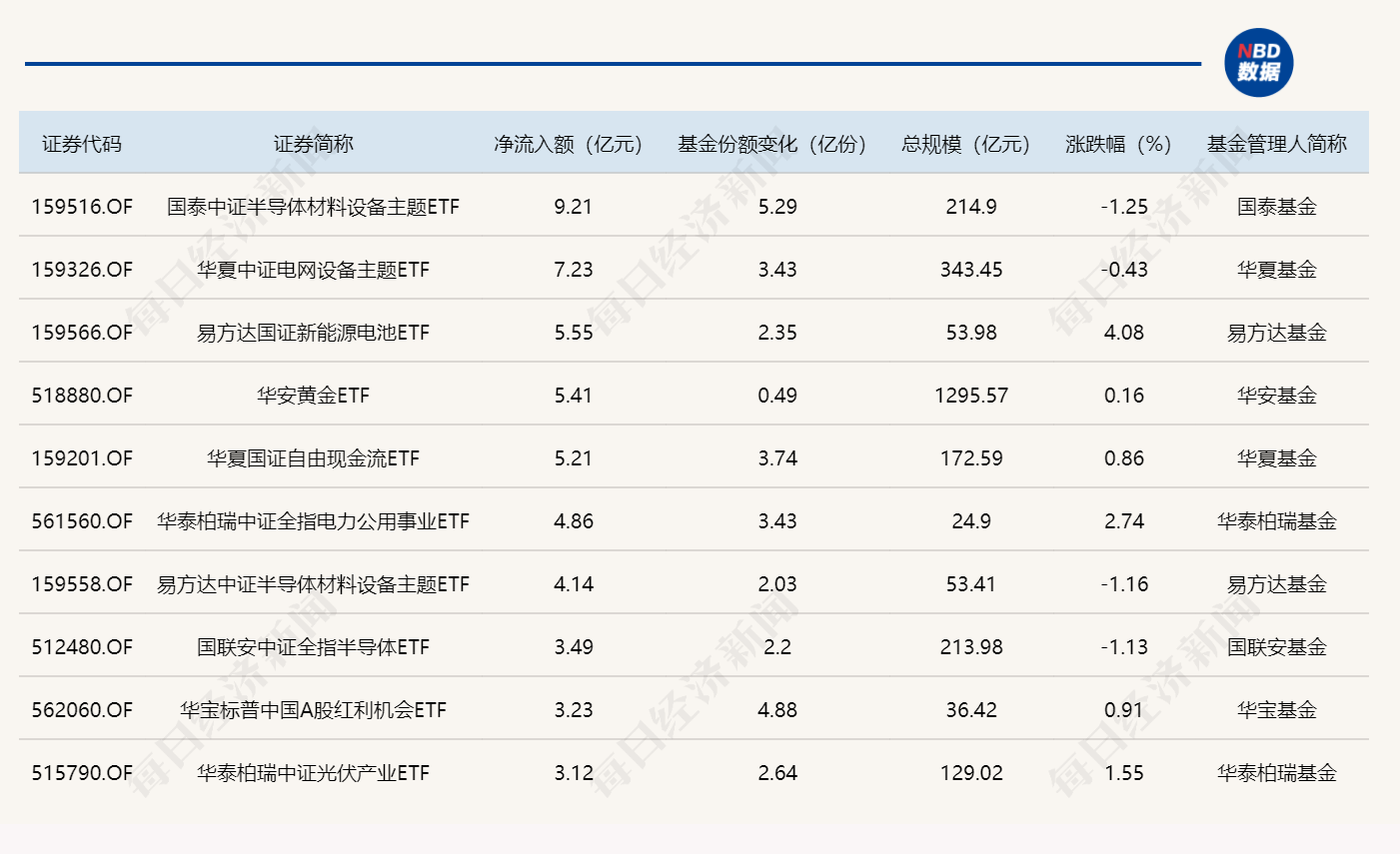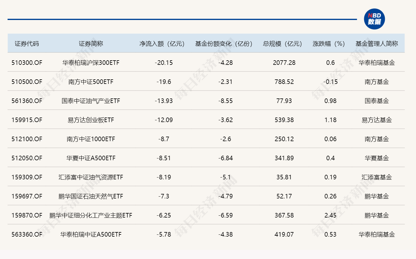 与此同时,华泰柏瑞沪深300ETF基金份额减少4.28亿份,净流出额20.15亿元;南方中证500ETF基金份额减少2.31亿份,净流出额19.60亿元;国泰中证油气产业ETF基金份额减少8.55亿份,净流出额13.93亿元。