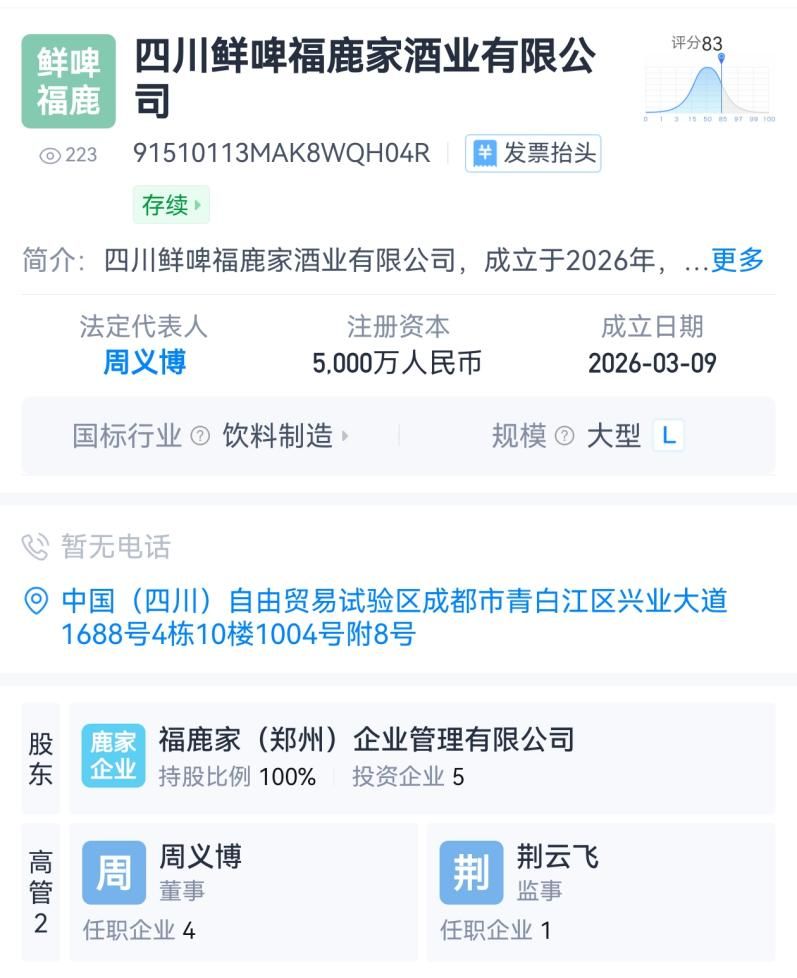而近期,蜜雪冰城鲜啤业务再落一子,在四川设立酒业公司。天眼查显示,3月9日,四川鲜啤福鹿家酒业有限公司成立,注册资本5000万元,由鲜啤福鹿家100%持股。