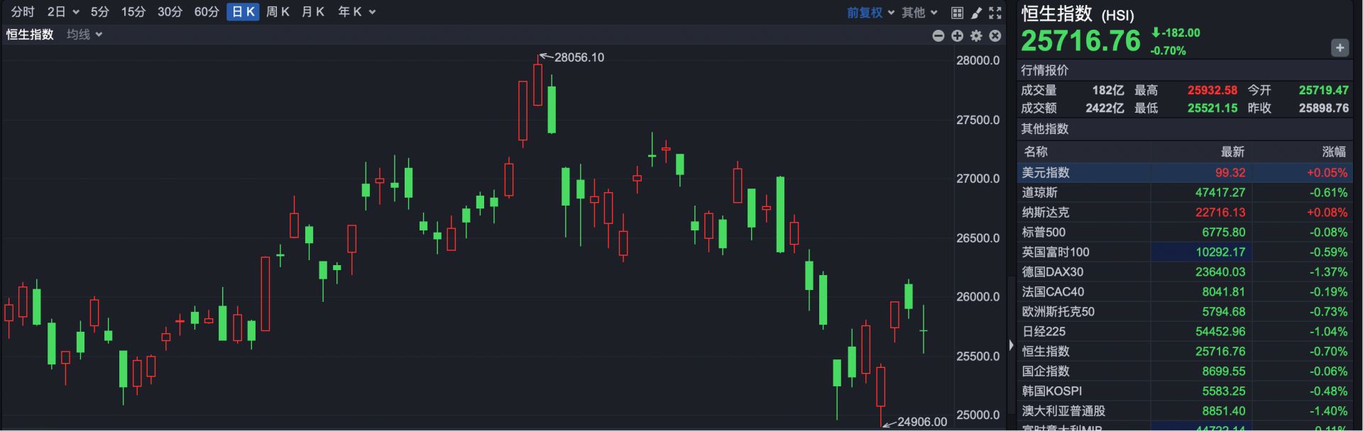 截至收盘,恒生指数报25716.76点,下跌182点,跌幅0.70%。港股全天仅成交2422亿港元,较昨日有所缩量。
