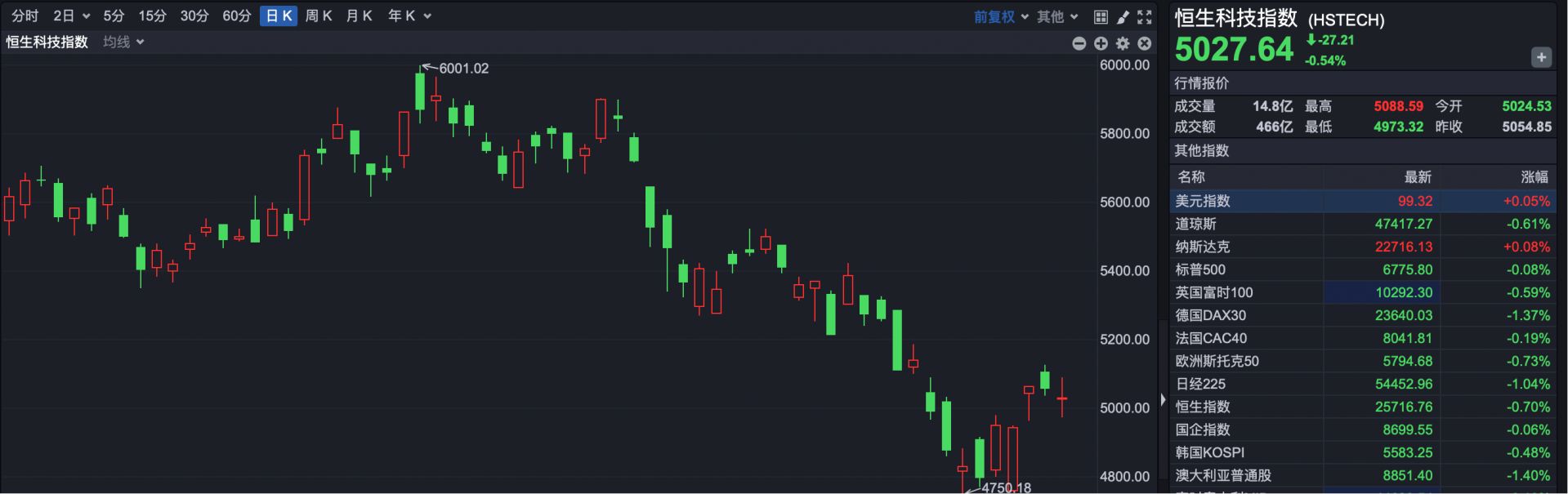 恒生科技指数收盘报5027.64点,下跌27.21点,跌幅0.54%。