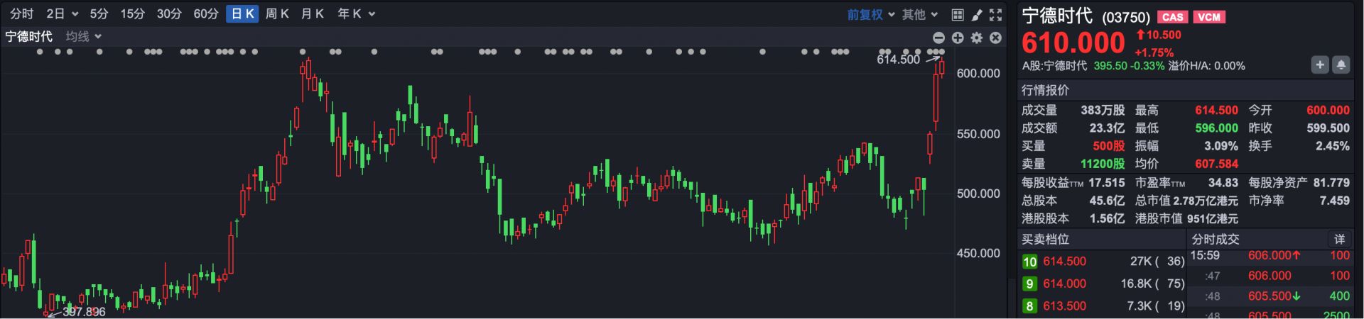 焦点公司方面,宁德时代(03750)逆势上涨1.75%,创下其在港股上市以来的历史新高。