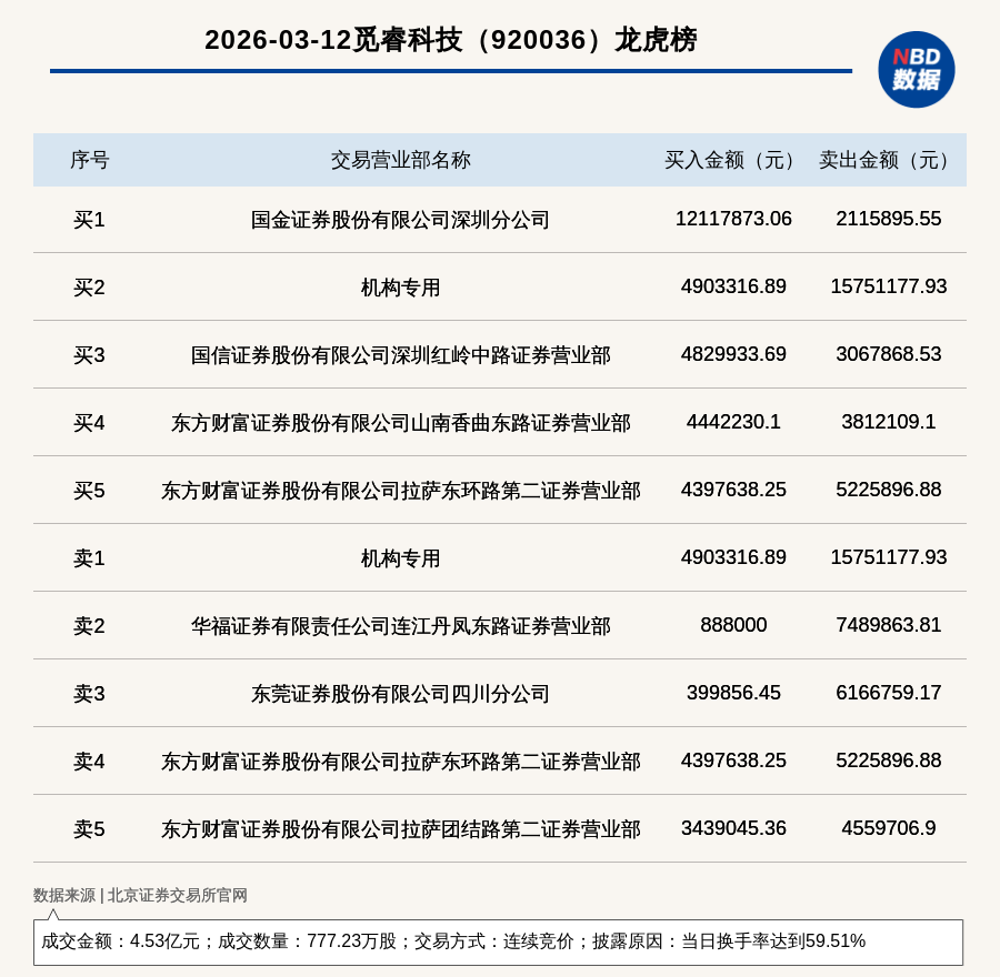 每经讯,2026年3月12日,北交所上市公司觅睿科技(920036,收盘价:61.8元)登上龙虎榜,交易方式是连续竞价,披露原因是当日换手率达到59.51%,成交数量777.23万股,成交金额4.53亿元。买一席位为国金证券股份有限公司深圳分公司,买入1211.79万元;卖一席位为机构专用,卖出1575.12万元。