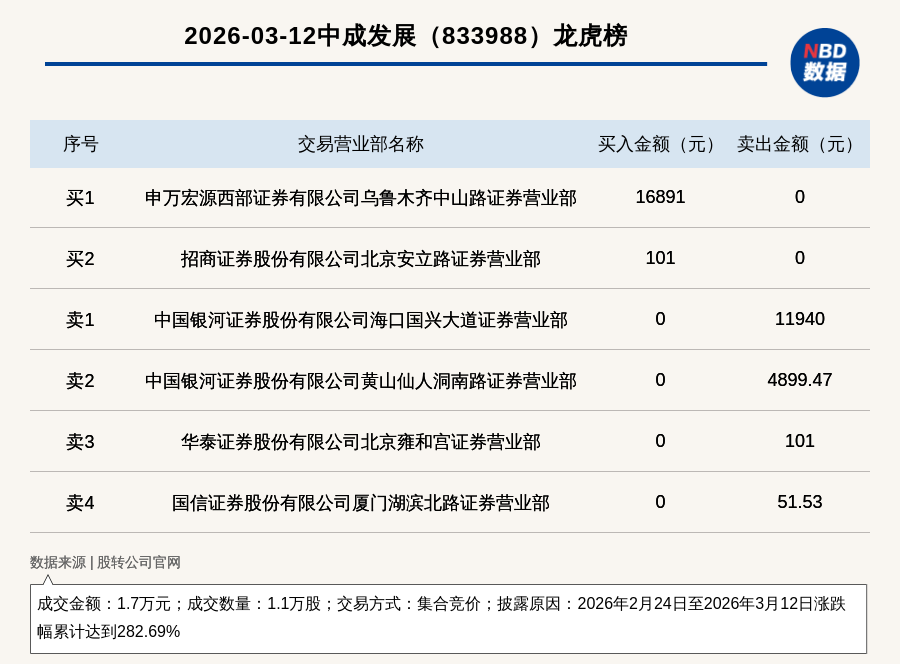 每经讯,2026年3月12日,新三板基础层公司中成发展(833988,收盘价:1.99元)登上龙虎榜,交易方式是集合竞价,披露原因是2026年2月24日至2026年3月12日涨跌幅累计达到282.69%,成交数量1.1万股,成交金额1.7万元。买一席位为申万宏源西部证券有限公司乌鲁木齐中山路证券营业部,买入1.69万元;卖一席位为中国银河证券股份有限公司海口国兴大道证券营业部,卖出1.19万元。