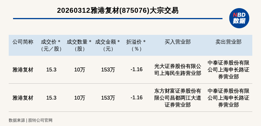 每经讯,2026年3月12日,新三板基础层公司雅港复材(875076,收盘价:15.48元)发生2笔大宗交易,总成交金额为306万元,成交金额最高的一笔成交价15.3元/股,成交数量10万股,成交金额153万元,折价1.16%。买入营业部是光大证券股份有限公司上海民生路营业部,卖出营业部是中泰证券股份有限公司上海申长路证券营业部。