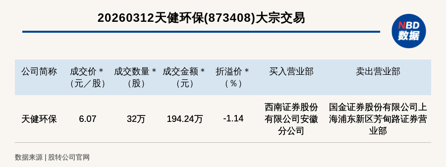 每经讯,2026年3月12日,新三板基础层公司天健环保(873408,收盘价:6.14元)发生一笔大宗交易,成交价6.07元/股,成交数量32万股,成交金额194.24万元,折价1.14%。买入营业部是西南证券股份有限公司安徽分公司,卖出营业部是国金证券股份有限公司上海浦东新区芳甸路证券营业部。