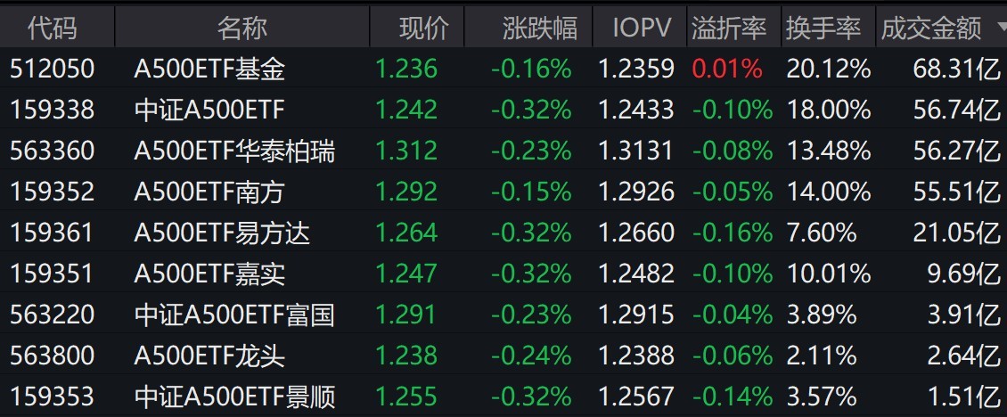 截至上午收盘,场内跟踪中证A500指数的ETF小幅下跌。其中,有9只中证A500相关ETF成交额超1亿元,3只超56亿元。A500ETF基金、中证A500ETF、A500ETF华泰柏瑞早盘成交额分别为68.31亿元、56.74亿元、56.27亿元。