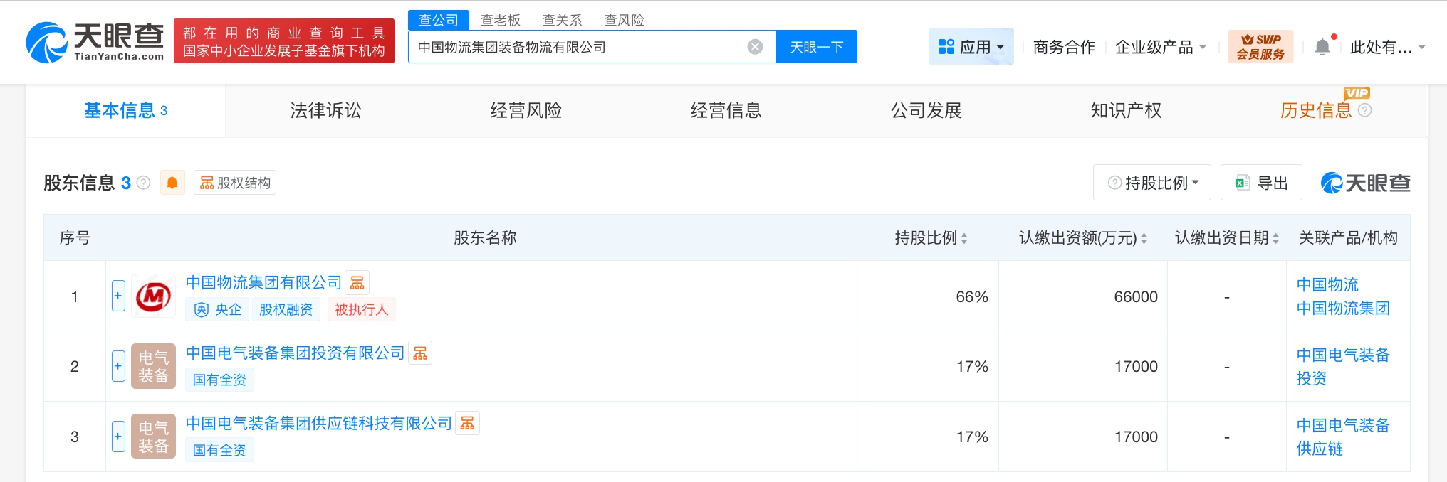 每经AI快讯,天眼查工商信息显示,近日,中国物流集团装备物流有限公司成立,法定代表人为张锐,注册资本10亿元人民币,经营范围包括国内货物运输代理、国际货物运输代理、国际船舶代理、供应链管理服务、普通货物仓储服务、装卸搬运、道路货物运输站经营等。股东信息显示,该公司由中国物流集团有限公司、中国电气装备集团投资有限公司、中国电气装备集团供应链科技有限公司共同持股。