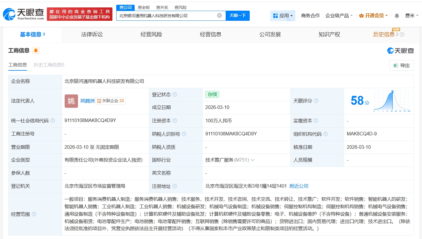 每经AI快讯,天眼查App显示,近日,北京银河通用机器人科技研发有限公司成立,法定代表人为姚腾洲,注册资本100万元人民币,经营范围包括服务消费机器人制造、服务消费机器人销售、智能机器人的研发等。股东信息显示,该公司由北京银河通用机器人股份有限公司全资持股。
