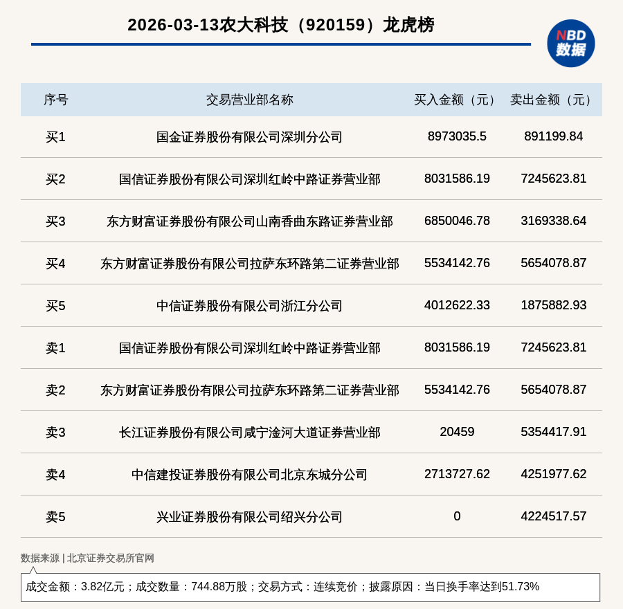 每经讯,2026年3月13日,北交所上市公司农大科技(920159,收盘价:51元)登上龙虎榜,交易方式是连续竞价,披露原因是当日换手率达到51.73%,成交数量744.88万股,成交金额3.82亿元。买一席位为国金证券股份有限公司深圳分公司,买入897.3万元;卖一席位为国信证券股份有限公司深圳红岭中路证券营业部,卖出724.56万元。