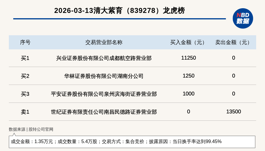每经讯,2026年3月13日,新三板基础层公司清大紫育(839278,收盘价:0.25元)登上龙虎榜,交易方式是集合竞价,披露原因是当日换手率达到99.45%,成交数量5.4万股,成交金额1.35万元。买一席位为兴业证券股份有限公司成都航空路营业部,买入1.12万元;卖一席位为世纪证券有限责任公司南昌民德路证券营业部,卖出1.35万元。