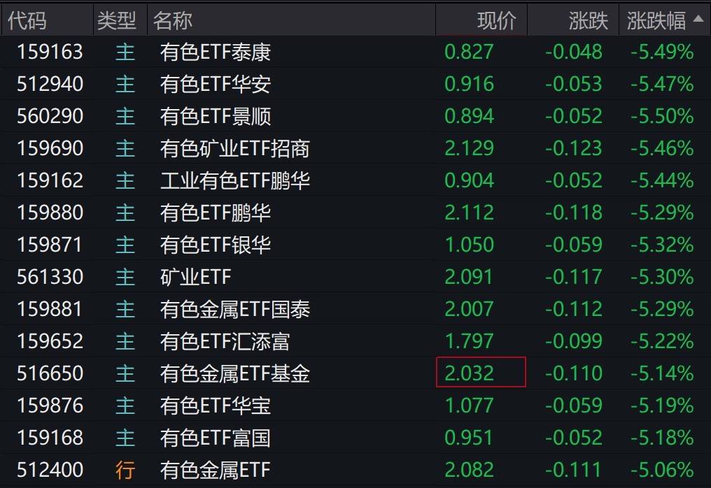 受盘面影响,有色、矿业相关ETF跌超5%。