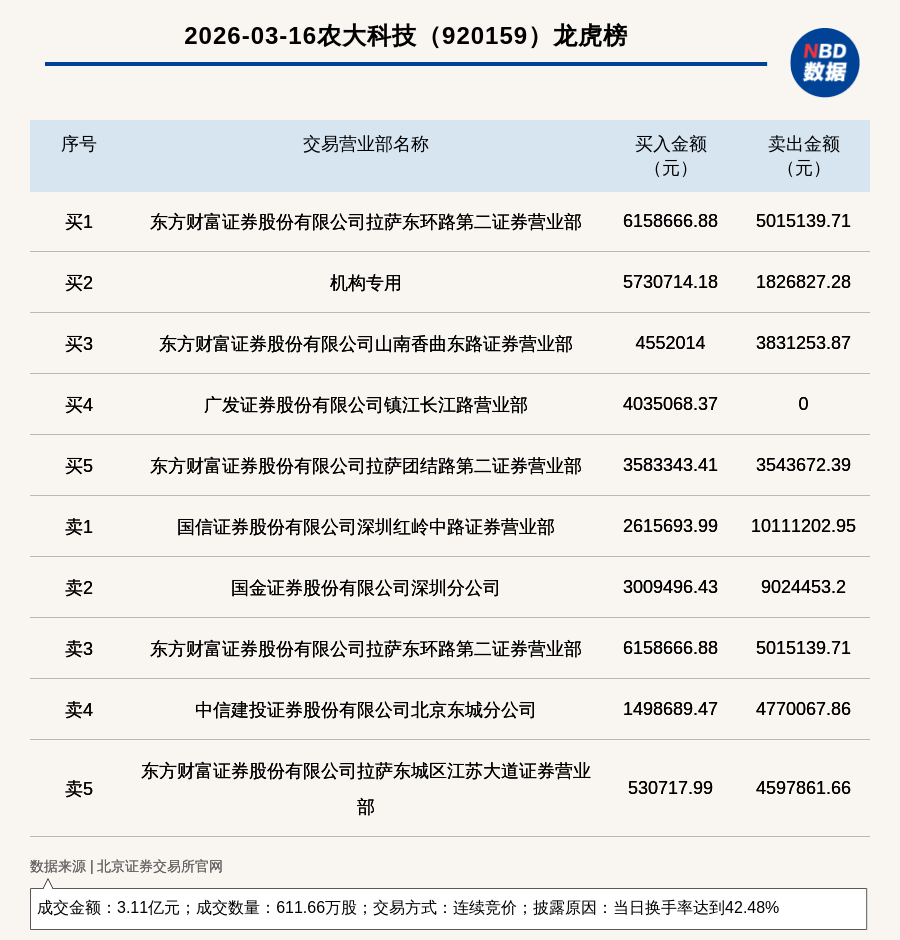 每经讯,2026年3月16日,北交所上市公司农大科技(920159,收盘价:48.07元)登上龙虎榜,交易方式是连续竞价,披露原因是当日换手率达到42.48%,成交数量611.66万股,成交金额3.11亿元。买一席位为东方财富证券股份有限公司拉萨东环路第二证券营业部,买入615.87万元;卖一席位为国信证券股份有限公司深圳红岭中路证券营业部,卖出1011.12万元。
