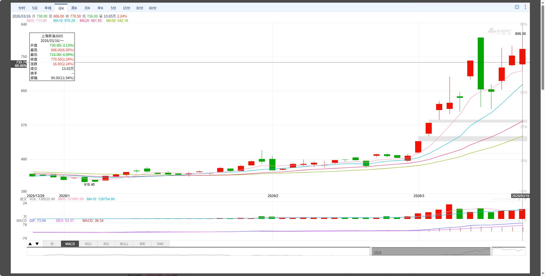 模拟账户举例:假设某交易者在3月13日判断原油期货04合约存在做多机会,以04合约700-710元附近进行模拟看涨,3月16日原油期货04合约上涨至765-799元附近,可获取一定盈利空间。当然若方向判断失误,同等逻辑亦面临对等亏损风险。(数据来源:文华财经,历史数据统计不预示未来表现。以上盈亏数据仅根据模拟交易举例,不作为实盘交易依据,交易可能造成本金损失,请谨慎决策)