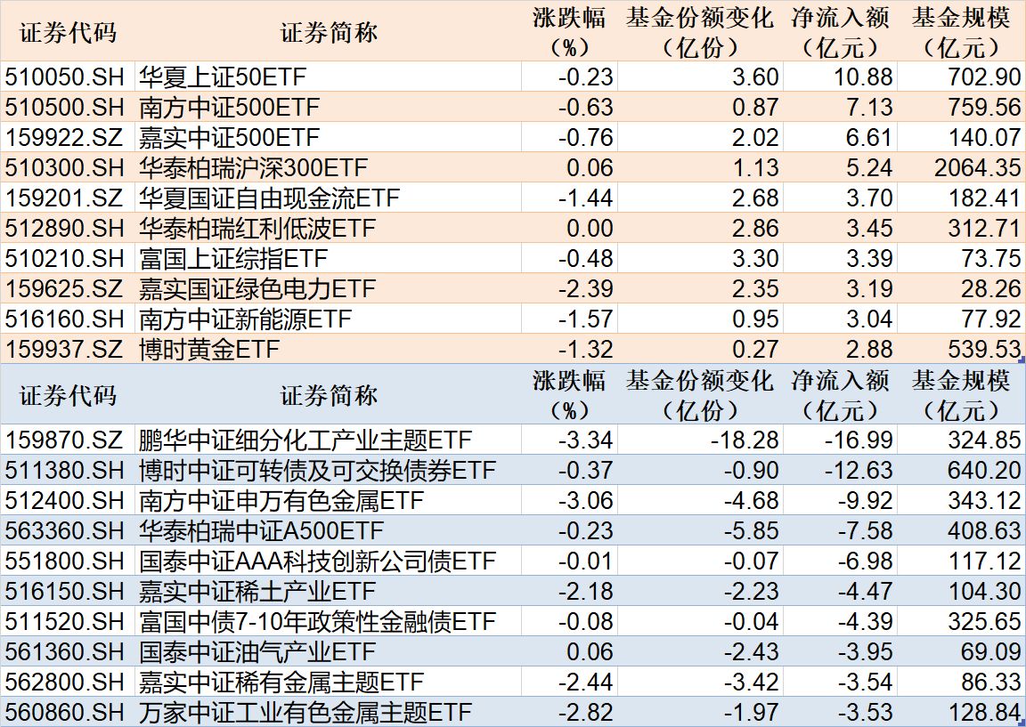 与此同时,鹏华中证细分化工产业主题ETF基金份额减少18.28亿份,净流出额16.99亿元;博时中证可转债及可交换债券ETF基金份额减少0.90亿份,净流出额12.63亿元;南方中证申万有色金属ETF基金份额减少4.68亿份,净流出额9.92亿元。