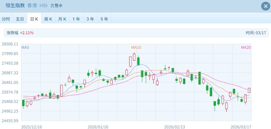 今日(3月17日),港股主要指数集体高开后维持震荡上行态势,市场风险偏好回升,科技、创新药等板块表现活跃,个股呈现涨多跌少格局。截至当日9时41分,主要指数全线飘红,大市交投逐步升温,延续前一交易日的回暖势头。