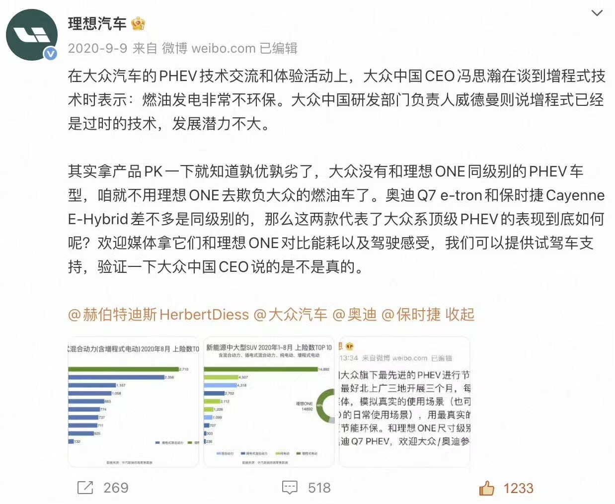 而在孙敏杰晒出的第二张微博配图里,理想汽车在2020年发布微博时称大众高管曾表示增程是过时的技术。