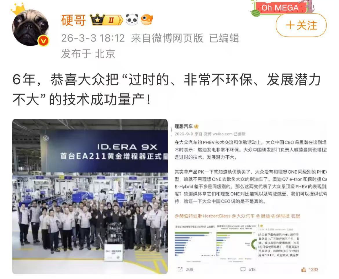 值得注意的是,上汽大众此次布局增程领域的动作,还引发了与理想汽车的一场隔空对话。3月3日,理想汽车公关部社交媒体总监孙敏杰(新浪微博@硬哥)发文称:“6年,恭喜大众把‘过时的、非常不环保、发展潜力不大’的技术成功量产!”其中一张配图是3月2日上汽大众宣布“EA211黄金增程器”正式下线的消息。