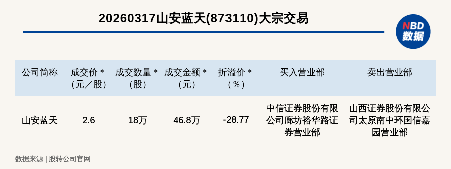 每经讯,2026年3月17日,新三板创新层公司山安蓝天(873110,收盘价:3.65元)发生一笔大宗交易,成交价2.6元/股,成交数量18万股,成交金额46.8万元,折价28.77%。买入营业部是中信证券股份有限公司廊坊裕华路证券营业部,卖出营业部是山西证券股份有限公司太原南中环国信嘉园营业部。