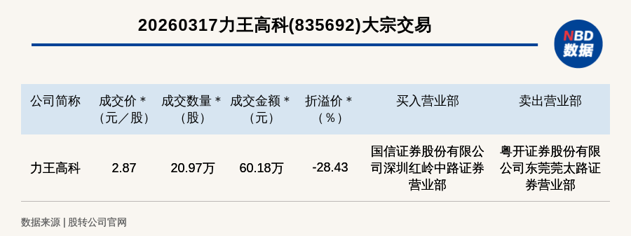 每经讯,2026年3月17日,新三板创新层公司力王高科(835692,收盘价:4.01元)发生一笔大宗交易,成交价2.87元/股,成交数量20.97万股,成交金额60.18万元,折价28.43%。买入营业部是国信证券股份有限公司深圳红岭中路证券营业部,卖出营业部是粤开证券股份有限公司东莞莞太路证券营业部。