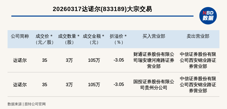 每经讯,2026年3月17日,新三板创新层公司达诺尔(833189,收盘价:36.1元)发生2笔大宗交易,总成交金额为210万元,成交金额最高的一笔成交价35元/股,成交数量3万股,成交金额105万元,折价3.05%。买入营业部是财通证券股份有限公司瑞安塘河南路证券营业部,卖出营业部是中信证券股份有限公司西安锦业路证券营业部。