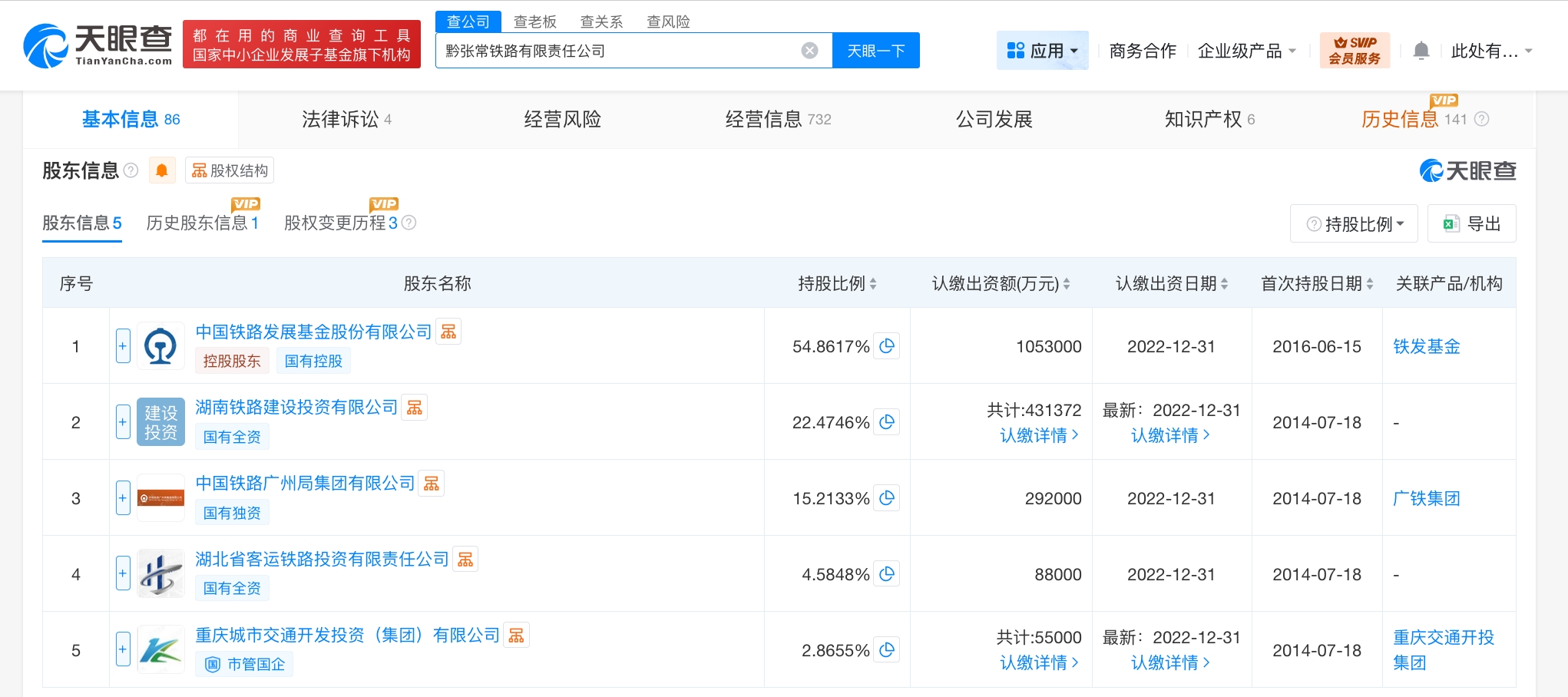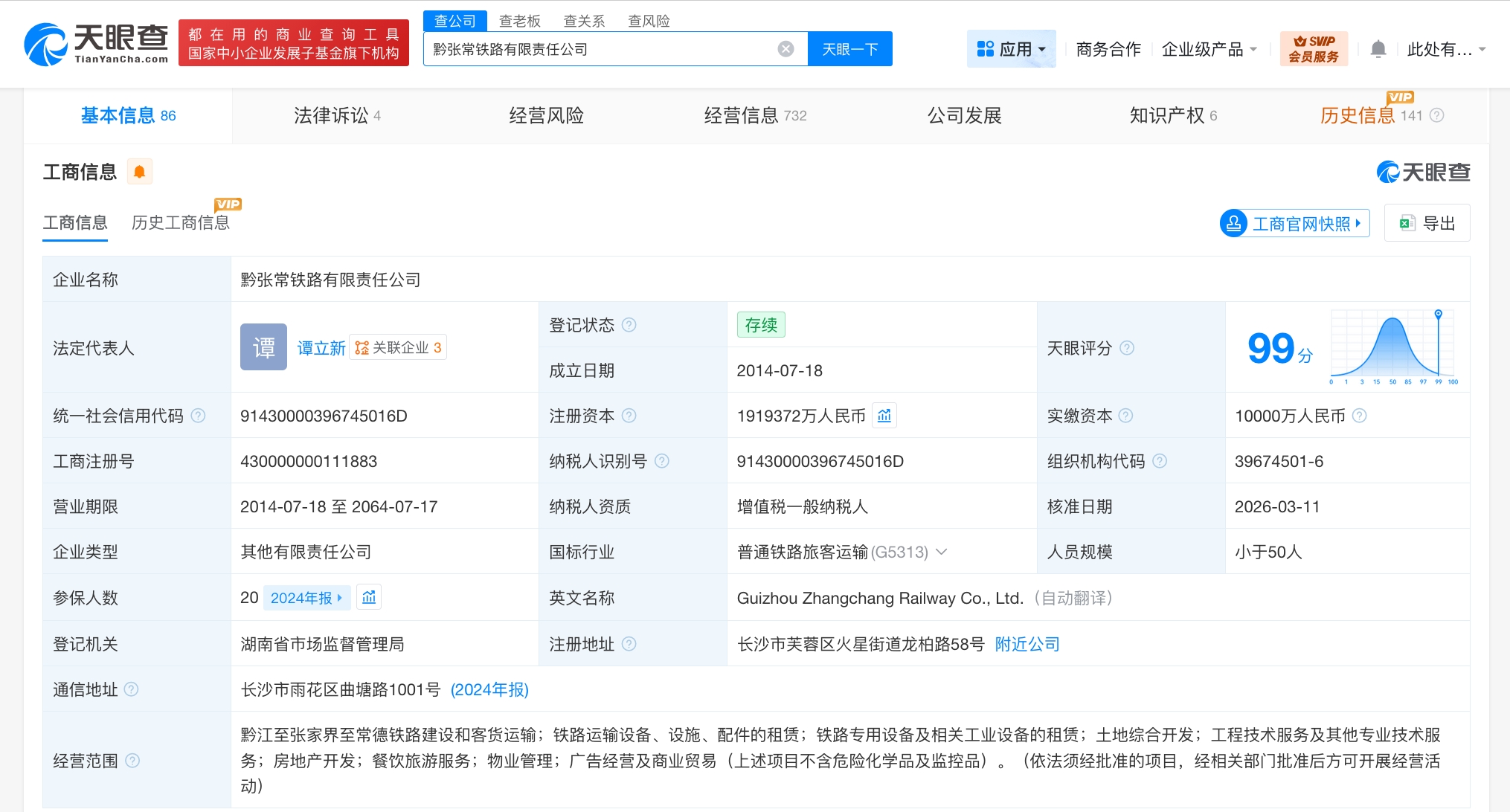 每经AI快讯,天眼查工商信息显示,近日,黔张常铁路有限责任公司发生工商变更,注册资本由1亿元人民币增至约192亿元人民币,增幅约19094%,新增中国铁路广州局集团有限公司为股东。黔张常铁路有限责任公司成立于2014年7月,法定代表人为谭立新,经营范围包括黔江至张家界至常德铁路建设和客货运输、铁路运输设备设施配件的租赁等。股东信息显示,该公司由中国铁路发展基金股份有限公司、湖南铁路建设投资有限公司、湖北省客运铁路投资有限责任公司及上述新增股东等共同持股。
