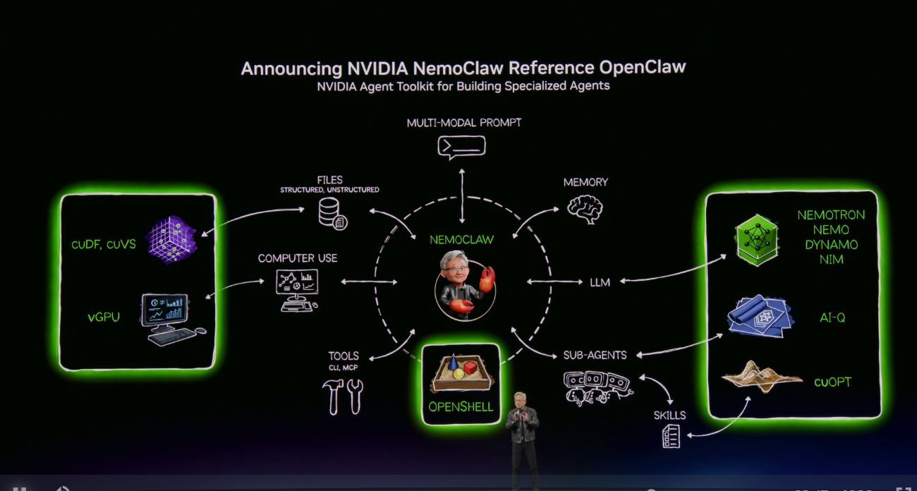 当地时间3月16日,英伟达CEO黄仁勋在“GTC 2026”演讲中发布7款新芯片及Vera Rubin超级计算机平台,宣布英伟达向AI基础设施公司转型。其战略核心围绕“烧更多Token”展开,通过构建系统生态、提供工具、优化成本提升算力效率,并推出NVIDIA NemoClaw™软件栈。业内认为,英伟达正倾向“卖铲子”模式,即提供算力生态与标准。