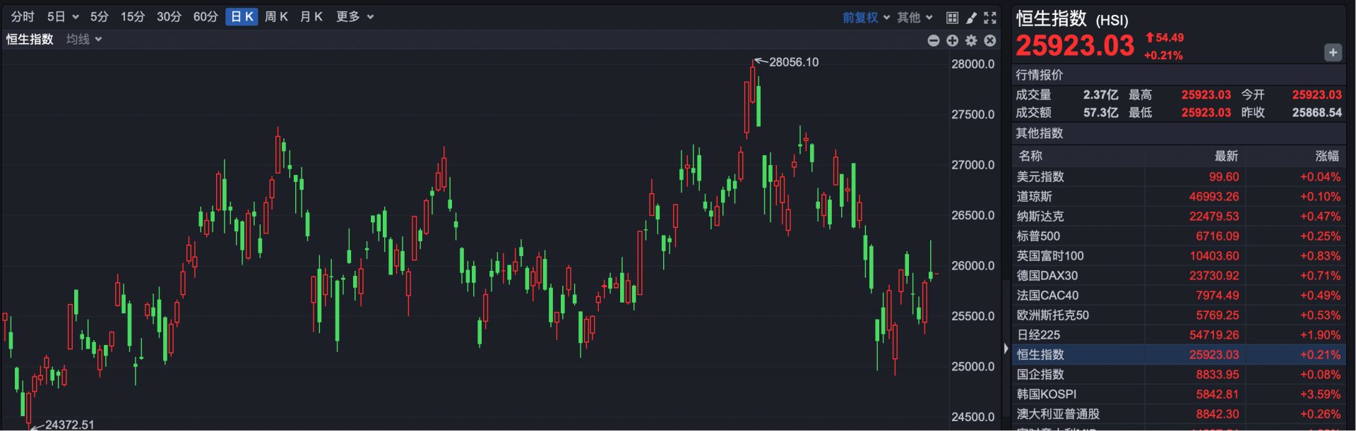 截至发稿,恒生指数开盘报25923.03点,上涨54.49点,涨幅0.21%。