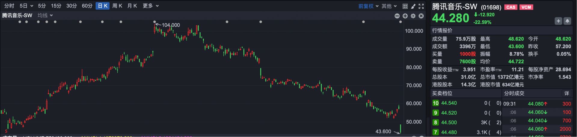 开盘之后,腾讯音乐港股跌幅迅速扩大到23%附近。去年8月13日,腾讯音乐港股一度创下104港元的历史新高,但7个月之后,其股价已经跌到最低43.6港元,阶段最大跌幅高达58%。