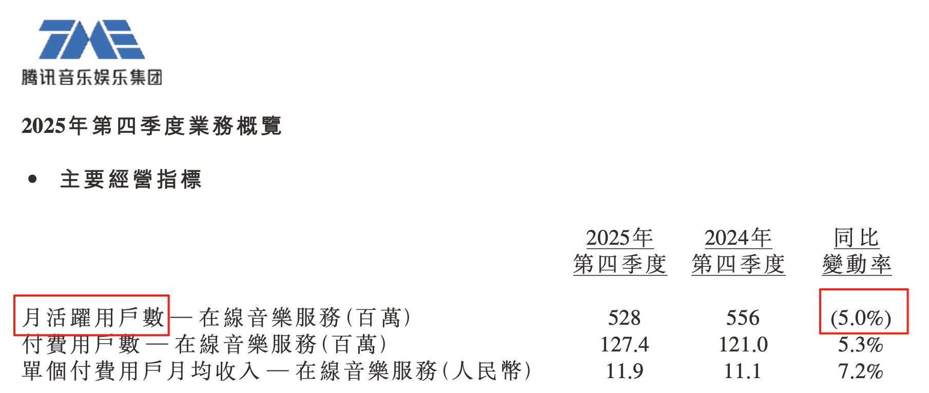 公告显示,腾讯音乐2025年第四季度月活用户数为5.28亿,较2024年第四季度的5.56亿同比下降5%。有分析认为,在线音乐市场的渗透率已经逼近天花板,月活用户的下滑是不争的事实。这背后是短视频平台,如抖音、快手等对其带来的冲击。