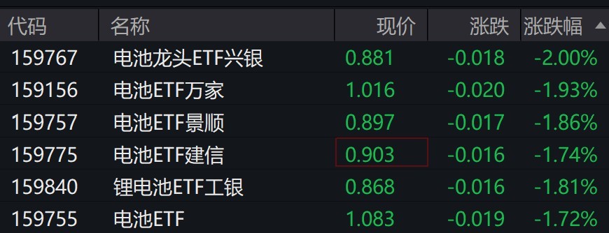 受盘面影响,电池相关ETF跌近2%。
