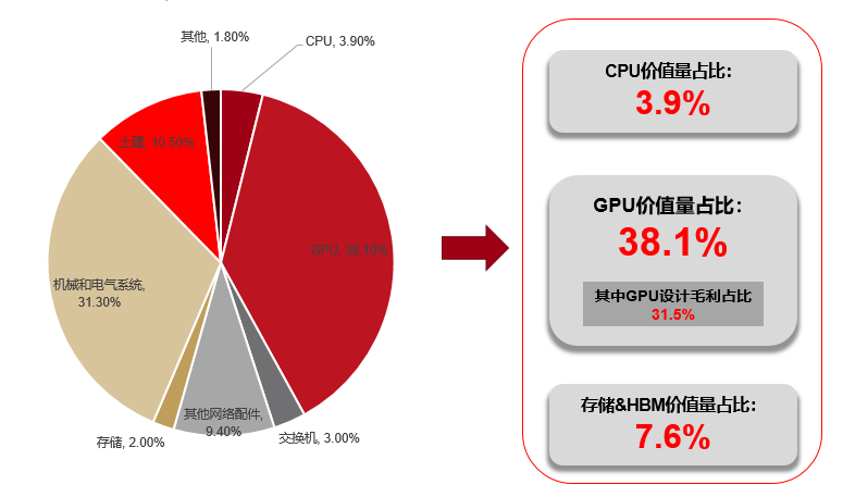 英伟达这一机型代表了目前英伟达能推出的算力集群的领先水平,该机柜可作为一个独立运作的计算算力平台进行运作,内部搭载了72个GPU芯片和36个CPU芯片。我们通过对其资本支出的拆分,来给大家更直观的认知:打造一台高端的人工智能算力设备,芯片设计在其中的毛利占比表现突出。我们在右侧给大家列示了相关数据,GPU设计毛利占比就达到了31.5%。芯片设计在领先的算力集群中的资本支出占比达到相当高的比例。