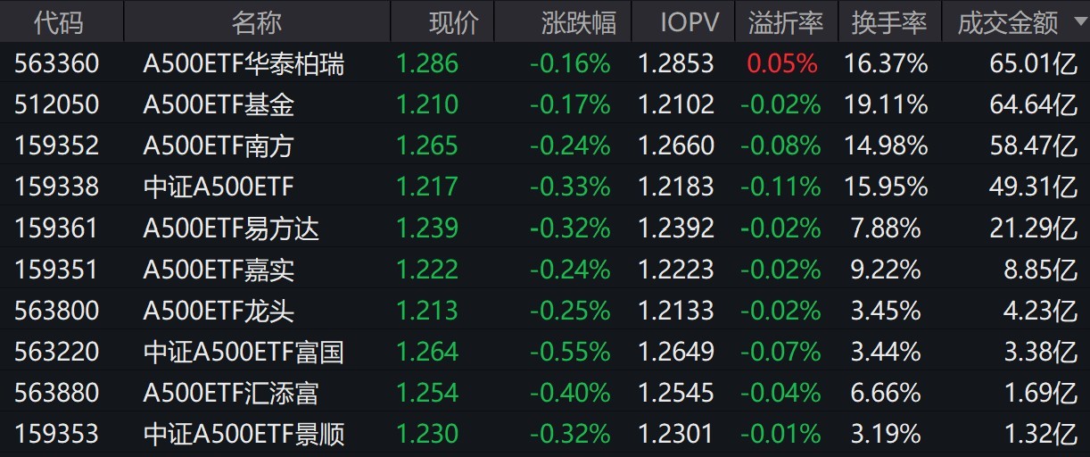 截至上午收盘,场内跟踪中证A500指数的ETF小幅下跌。其中,有10只中证A500相关ETF成交额超1亿元,2只超64亿元。A500ETF华泰柏瑞、A500ETF基金早盘成交额分别为65.01亿元、64.64亿元。